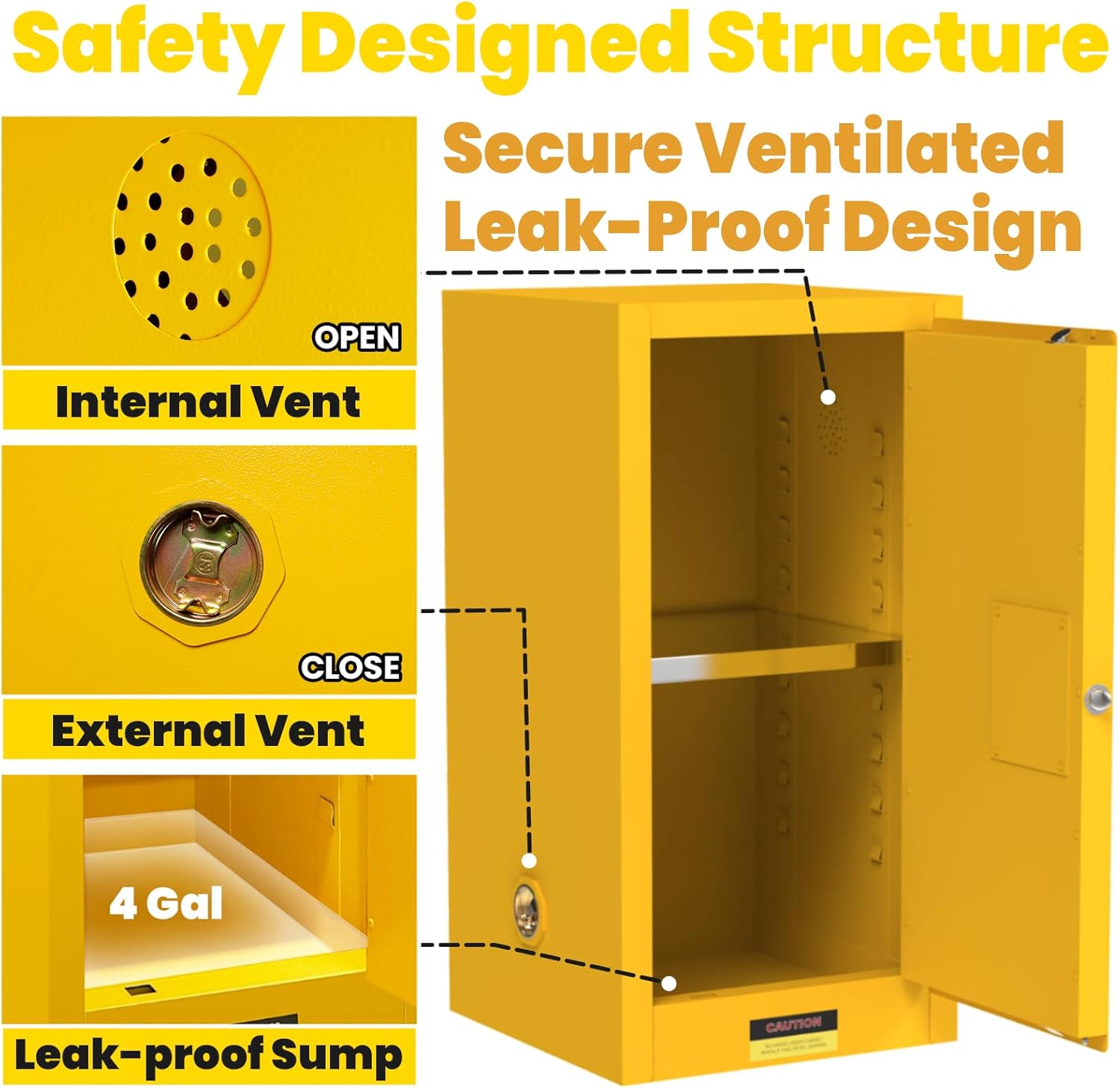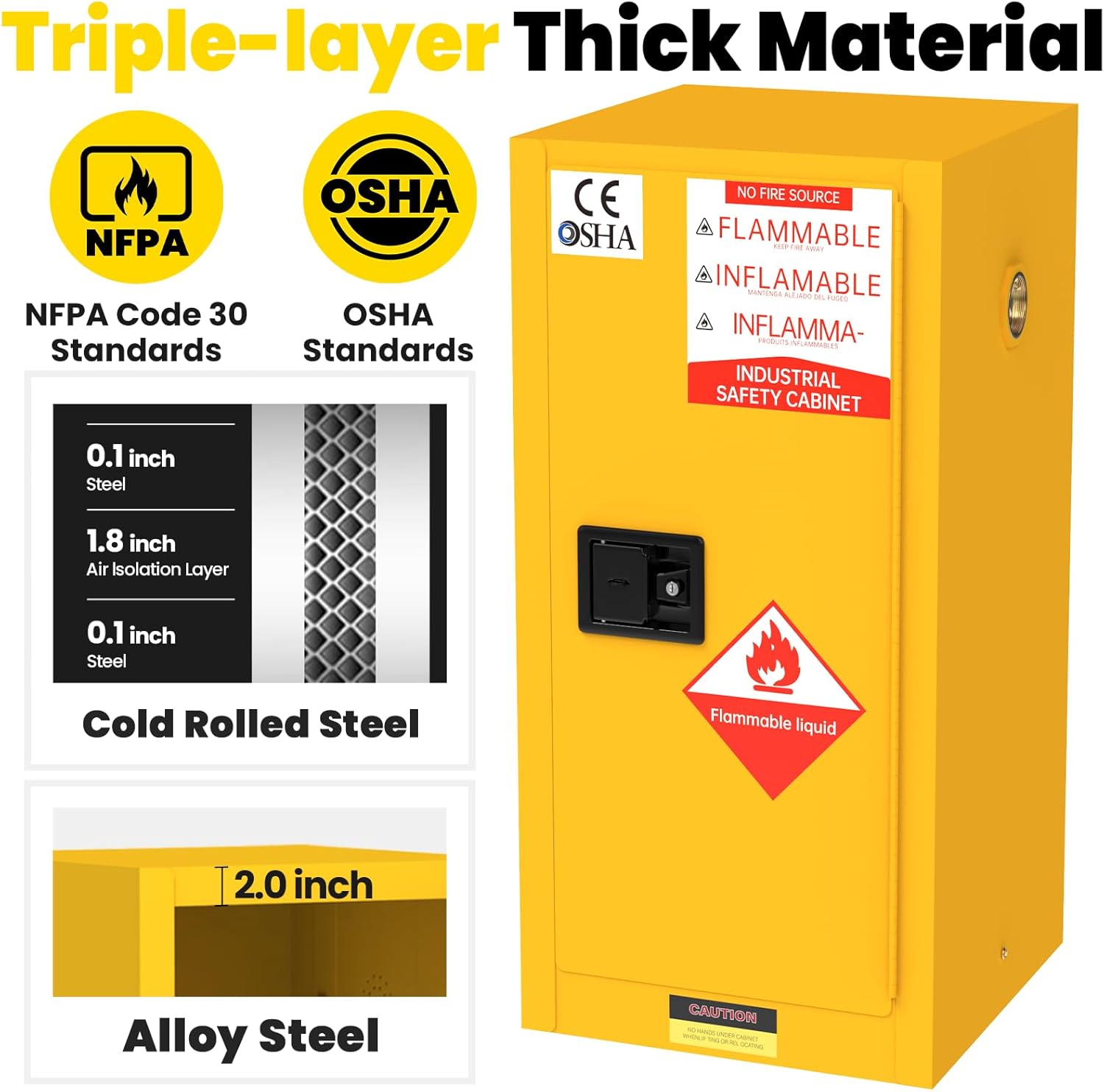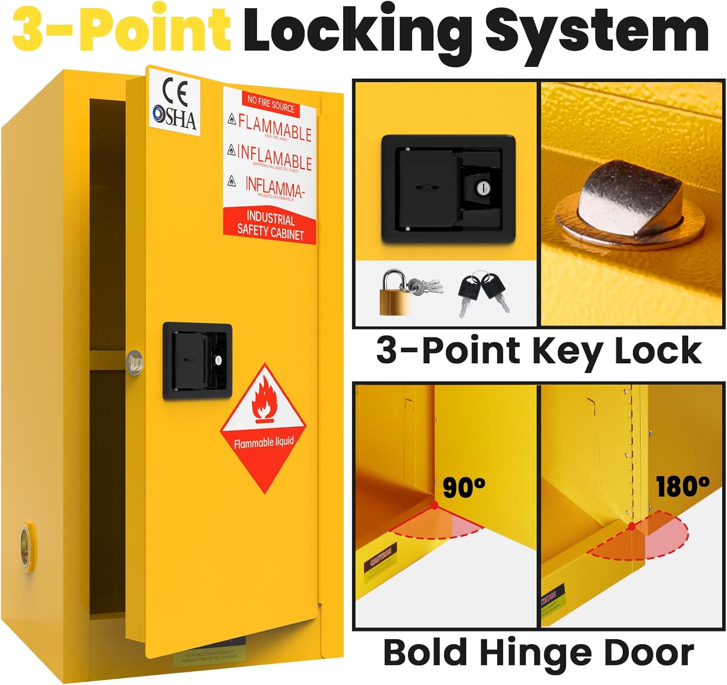 Our flammable storage cabinet stands out due to its superior construction and adherence to stringent safety standards. The double-walled cold-rolled steel structure provides exceptional resistance to corrosion, rust, and leaks, while the 3-point safety lock and self-latching doors offer reliable security. With international certifications and a focus on durability, this product ensures long-term performance and peace of mind. We prioritize customer satisfaction, offering responsive support to address any concerns promptly.