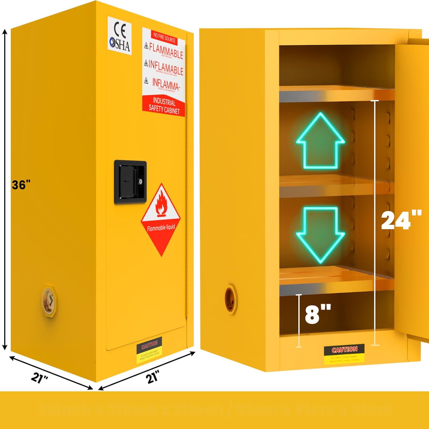 This cabinet is designed for environments that require safe storage of flammable liquids and hazardous materials, such as laboratories, hospitals, research institutes, workshops, chemical plants, and manufacturing facilities. It is ideal for professionals in industrial and scientific fields who need organized, compliant storage solutions to prevent accidents and meet OSHA guidelines. The floor-mount design and adjustable shelf make it versatile for various room types, including garages and storage areas, where space efficiency and safety are priorities.