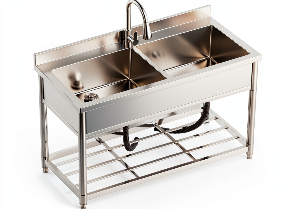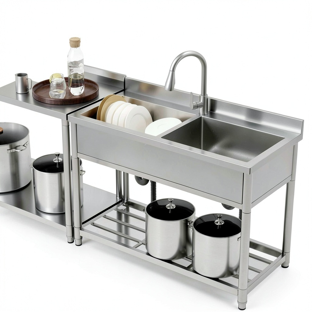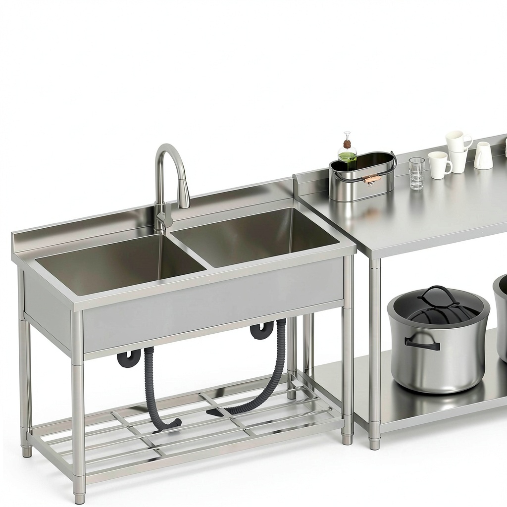 Transform your kitchen with the GGW stainless steel utility sink, designed for durability and efficiency in demanding environments. Constructed from premium stainless steel with a thickened frame, this freestanding sink measures 47.2 inches wide, 21.7 inches deep, and 37 inches high, offering ample space for various tasks. It features two large, deep basins that facilitate multitasking, a 360-degree rotating pull-out faucet for full sink access, and a convenient grid shelf for organized storage. The sink includes adjustable foot pads to ensure stability on uneven floors and comes as a complete set with all necessary drain assembly components for straightforward installation. With an industrial style and stainless steel finish, it combines robust construction with practical functionality, making it suitable for home kitchens, workshops, or light commercial use.