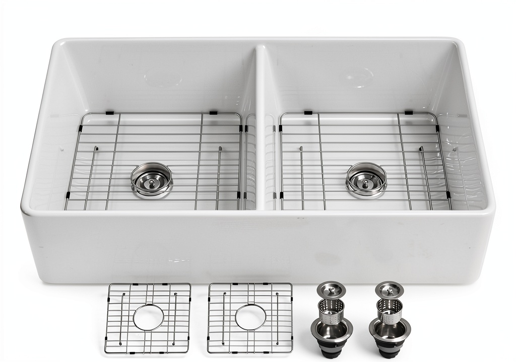The Kichae 32-inch white farmhouse sink is crafted from high-quality ceramic, offering superior durability and a polished finish. With exterior dimensions of 32″W x 20″D x 9″H, it features a rectangular shape, grid drain, and two holes for faucet installation. This double bowl sink is designed for farmhouse-style kitchens, providing ample space for washing dishes and food preparation. Its fireclay material, fired at 2900°F, ensures resistance to chipping, staining, and impacts, making it a long-lasting addition to any home.
