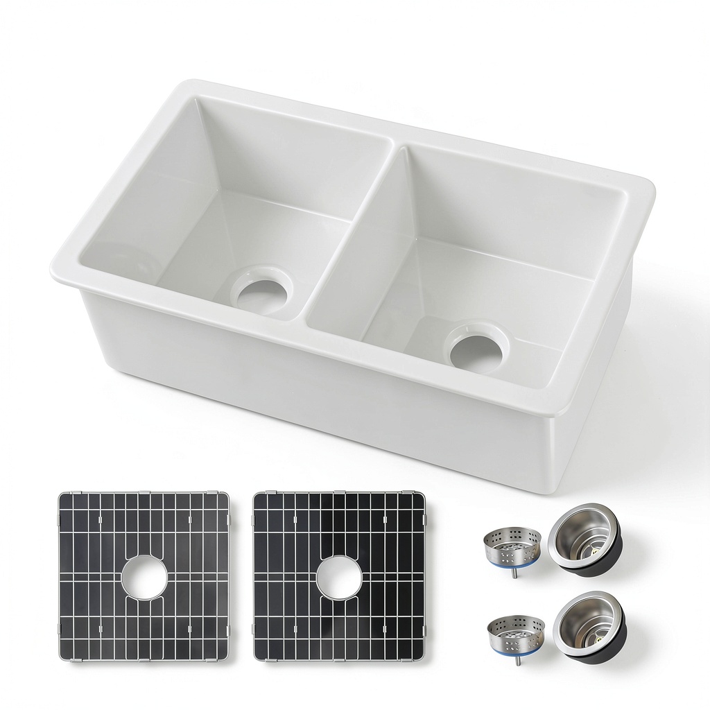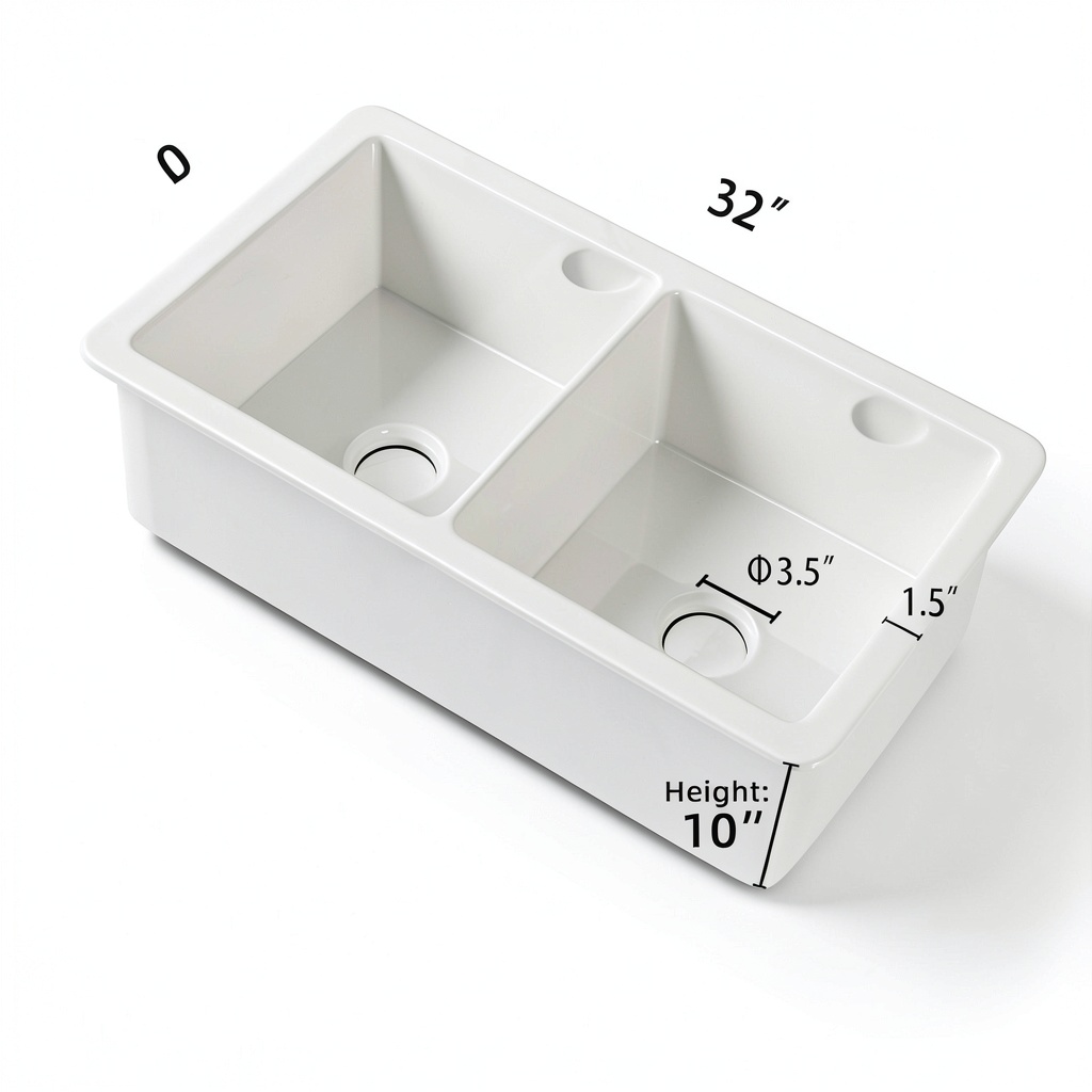 The Miuara fireclay double bowl kitchen sink in glossy white is crafted from high-quality fireclay, fired at over 2600°F for exceptional hardness and longevity. Measuring 32 inches wide by 19 inches deep and 10 inches high, it features a polished finish and rectangular shape with a dual mount design for undermount or topmount installation. Key specifications include a 9-inch internal depth, 1.5-inch wide deck, and compatibility with 3.5-inch garbage disposers, making it a robust choice for modern kitchens.