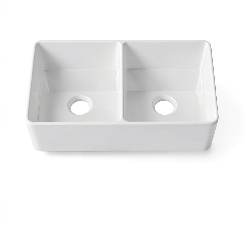 The Miuara fireclay farmhouse sink is a 33-inch double bowl model crafted from 100% fine natural fireclay, fired at over 2600°F for 26 hours to ensure exceptional hardness and sturdiness. Its glossy white finish, achieved with ultra-fine Italian glaze, provides a smooth, stain-resistant surface that withstands daily kitchen use. Key specifications include dimensions of 18″D x 32.75″W x 10″H, an internal depth of 9 inches, and a minimum base cabinet requirement of 36 inches. The sink features a reversible design, polished finish, and includes components such as stainless steel drain strainers, protective bottom grids, and a user manual, all backed by a 3-year limited warranty.